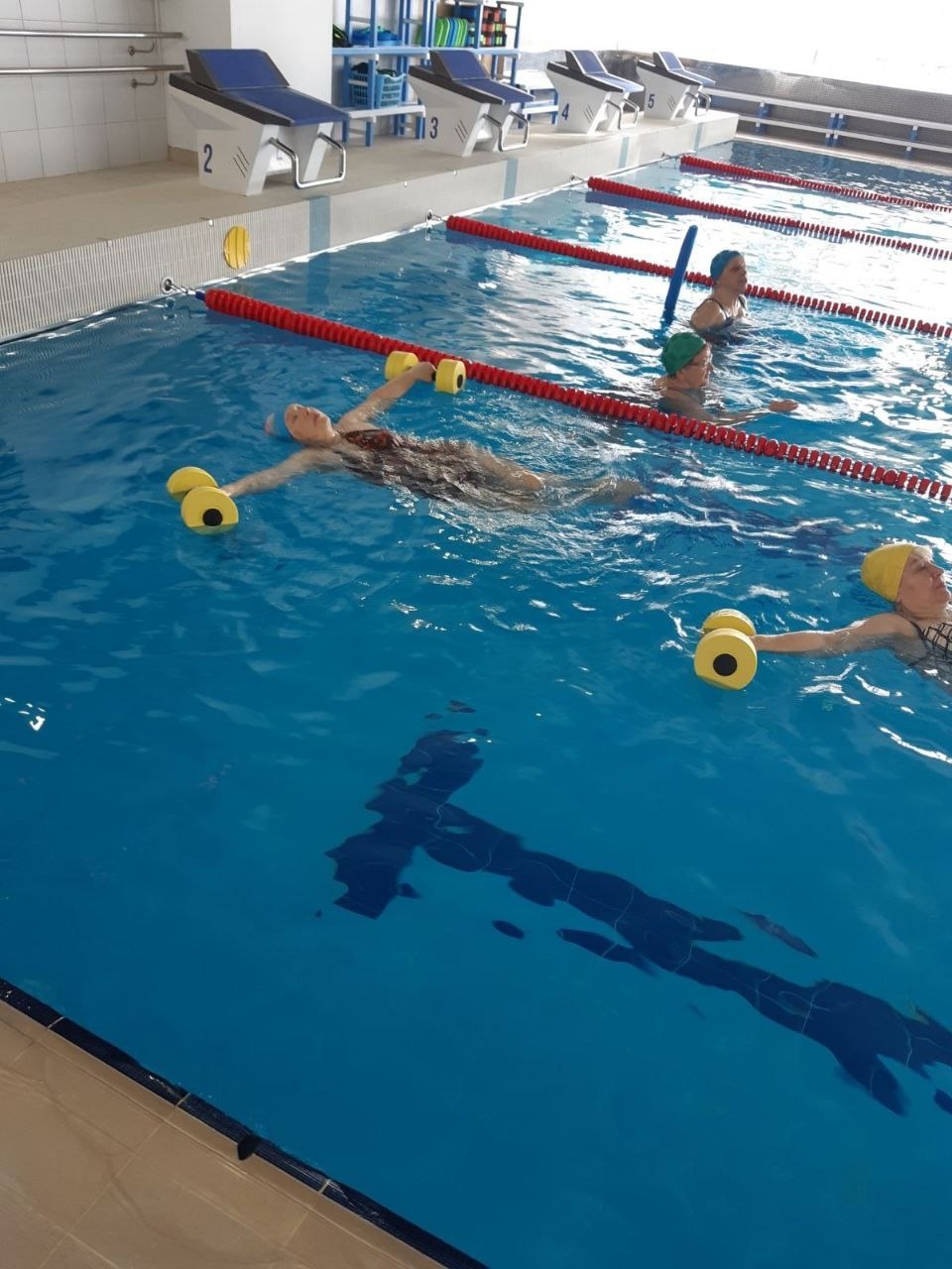 В бассейне спортивного комплекса "Молодость" под руководством инструктора по спорту Булейко Евгении Андреевны для взрослого населения, занимающихся в том числе и адаптивной физической культурой состоялось открытое занятие на актуальную тему: «Повышение уровня здоровья посредством аквааэробики».