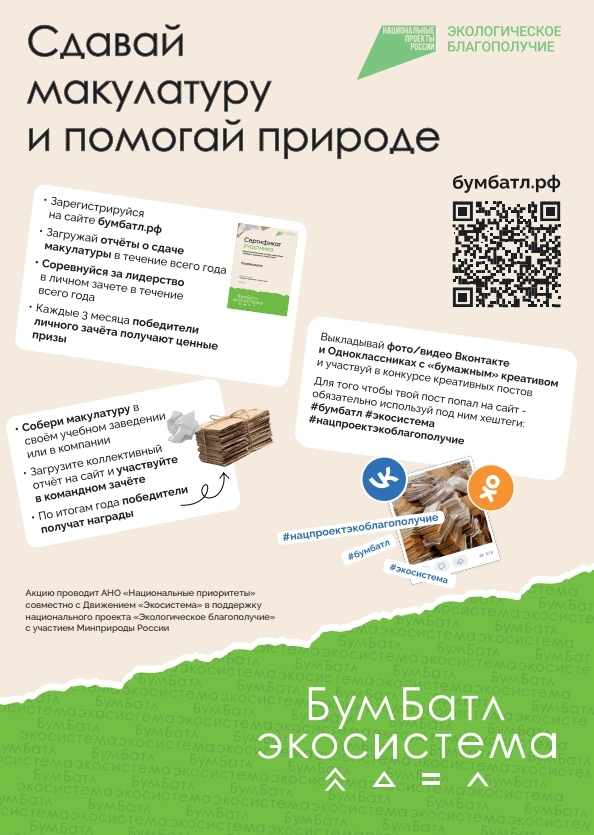 Это всероссийская инициатива по сбору макулатуры в поддержку национального проекта «Экологическое благополучие», реализуемого по поручению Президента. Акция проводится под эгидой движения «Экосистема» и дает каждому возможность заботиться о нашей планете.