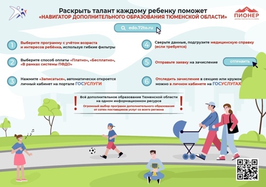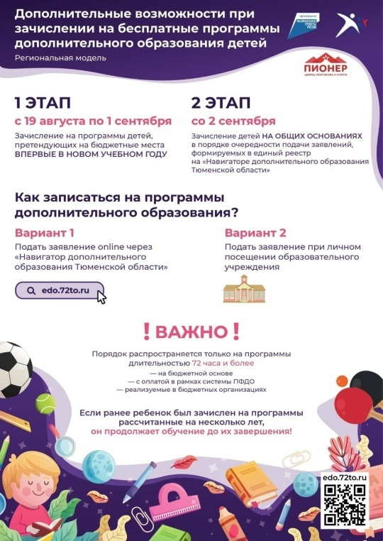Запись на программы дополнительного образования стартует 19 августа 2025 года с 8.00 часов через официальный электронный портал «Навигатор дополнительного образования Тюменской области» – edo.72to.ru